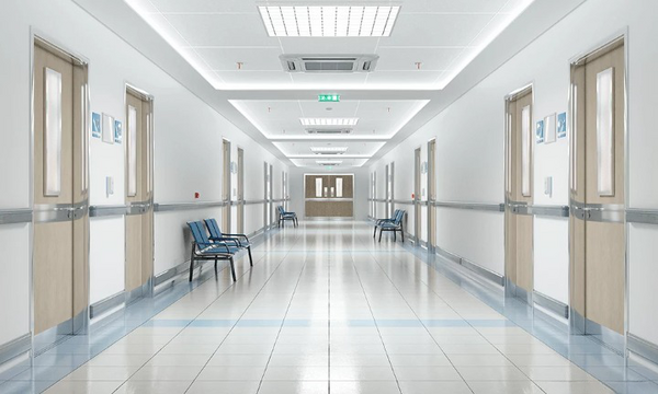 El nivel comienza a partir de un complejo de pasillos similares a los pasillos de un hospital moderno. Las paredes están revestidas con una pintura lisa de color blanco. Se aprecia una protección horizontal a media altura, probablemente de acero inoxidable o un material sintético resistente a los golpes y fácil de limpiar. El suelo está cubierto con baldosas de cerámica de color claro, con un acabado antideslizante. También se pueden observar zócalos sanitarios en la unión con la pared. El techo está hecho de placas modulares blancas de fibra mineral, con paneles de luz fluorescentes integrados.