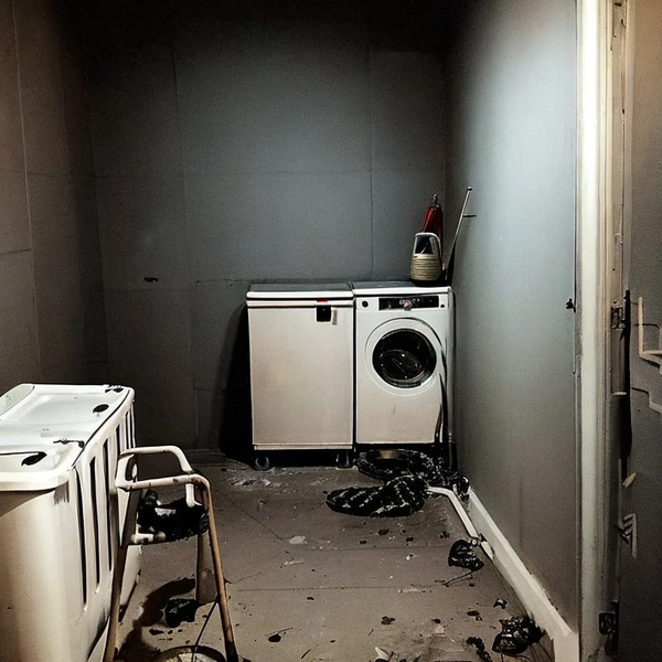 Hay tuberías que gotean agua de la colina que tiene encima este cuarto, ya que su hierba es húmeda. También hay una lavadora que está en constante funcionamiento.