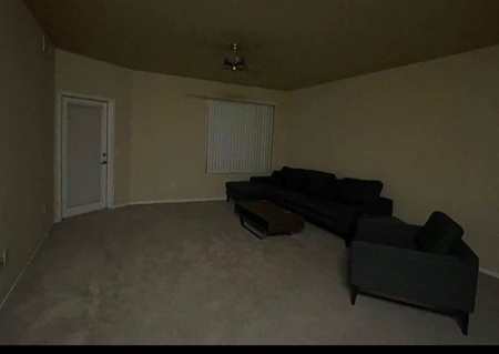 La sala está compuesta por un largo sillón y otro individual, con una mesa ratona en el centro. El suelo está húmedo, algo pegajoso, sucio y descuidado. Las paredes, de un color amarillo opaco, pueden mostrar un patrón floral marrón, aunque esto no es común. La única ventana de la habitación permanece sellada: la cortina está hecha de un material tan duro que resulta imposible de mover o abrir.