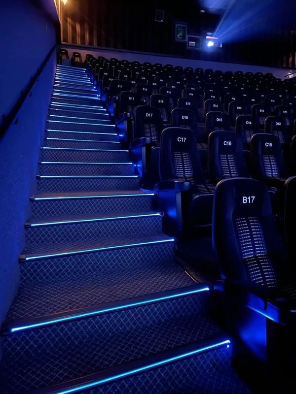 Al igual que en 🌎 Los Frontrooms 🌎, las salas de cine son muy amplias, lo suficiente como para albergar la imponente pantalla. Las butacas son acolchadas y cómodas, dispuestas perfectamente en hileras escalonadas. Se encuentra un sistema de sonido envolvente a través de altavoces ubicados en los frontales, laterales y traseros, con paneles fonoabsorbentes en paredes y techo que garantizan una acústica impecable, lo que elimina ecos y reverberaciones. La iluminación es tenue, y se limita a luces de guía en pasillos y escalones que se apagan por completo al inicio de la función.