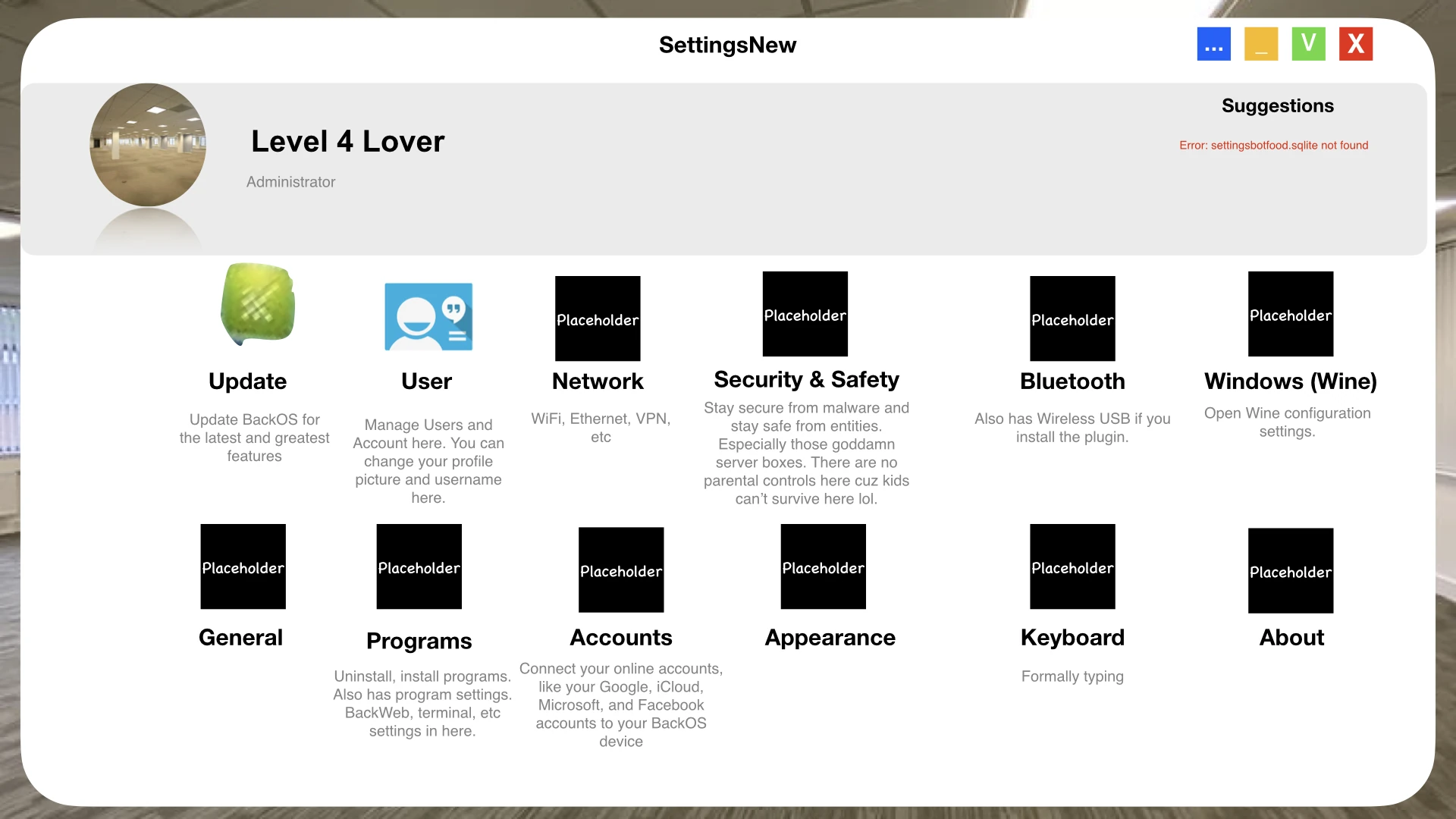 BackOS is an backrooms operating system made by Almond Water Inc.TM and Research Group of Almond Water Inc.TM. The OS isn't finished yet. It looks similar to Windows 3.1x, however, it's not a copy. The OS itself is made for communication and as a source of information. The look in early stages of development look really poor, but later it got improved. It uses internet. It doesn't support mobile devices. The company said that they will make this OS in Level 1980. It's a useful information due to that everyone knows from where get it. The operating system is practically done, but there are testing sessions before release to make sure it's bulletproof. The only language for this OS is
