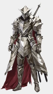 The default form of the Crimson Wanderer is an over 2 meters tall knight in a fantastic metal armor, complete with an old, worn-out red cape. He carries a claymore that he kept on his back, but he often drags it across the floor, causing a loud, scratching noises as a while he approach his target. Considering his heavy movement, it's estimated that his weight, complete with his armor and weapon, is about half a metric ton.
