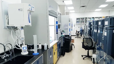 A sample preparation lab. This room is stocked with lab glassware and fume hoods. There are instruments for titrations and flashpoints, there are electronic balances, centrifuges, pH strips, thermometers, pipettors, etc. Operators may use this lab to test certain properties of the chemicals they are working with such as pH, boiling point, flash point, etc.