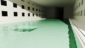Level 188.8 is a peculiar sub-level, mainly due to its appearance resembling a combination of Level 37 and Level 188. The appearance of the level alone has prompted many theories and hypotheses regarding the origin of the sub-level. But being primarily the sub-level of Level 188, Level 188.8 is an enclosed edifice reminiscent to that of a hotel, consisting of various rooms, corridors, windows, balconies, etc. However, the bottom of the sub-level is submerged under -2°C water. The amount of water results in an extremely humid setting, reportedly reaching as high as 95% humidity. As a result, visibility is less than most other pool-based levels. The sub-level inherits a reflective white ceramic tile texture that makes up the floors, ceilings, and walls of the building, as well as a waterfall in the central courtyard that is presumably the source of all the water currently inside the sub-level.