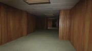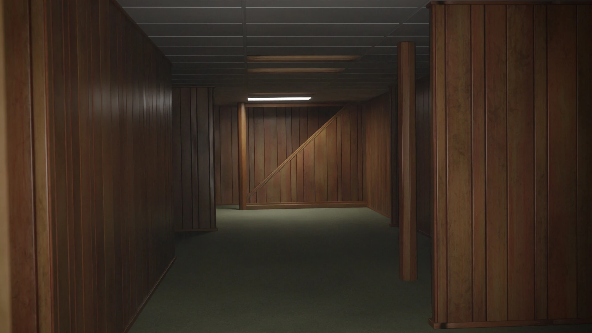 Each room is made with the same materials, with the floor being dry, grey carpet, and the ceiling being made of large white ceramic tiles with the occasional warm glowing fluorescent light. The walls, however, are lined with vertical wooden planks from bottom to top. Some areas are darker than others, but pose no threat whatsoever to the wanderer.