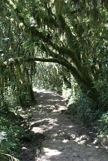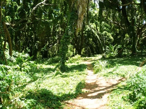 Vines are present in every direction, extending from trees and looping around trunks. The ground vegetation includes wide-leafed plants, high ferns, and tightly clustered bushes with thorned fruits. Many of these plants move slightly even when there is a lack of wind. Some areas are so densely vegetated that walking in a straight line is impossible without cutting tools.