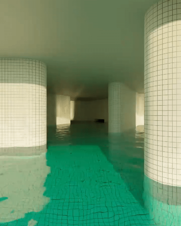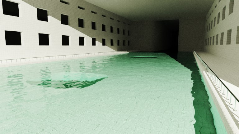 After numerous explorations, boundless journeys through unquantifiable locations, it seems I have finally reached a place of solitude. Endless halls, long darkly-lit corridors, empty structures of no end; those are what I have become accustomed to. This, however, is my first breathing point in a storm of chaos and confusion — a peaceful point where I can finally rest. Never before have I witnessed architecture such as this; brightly-lit rooms with pools of blue water, surrounding one’s body like a warm embrace. White ceramic tiles make up the walls and floor, reflecting the light and leaving no corner untouched by its radiance.