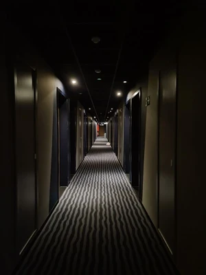 Regardless of having a straightforward floor plan, a building's hallways periodically possess a bizarre layout that makes individuals uncomfortable. For instance, a corridor might display a pattern of abrupt zigzags that continuously shift direction as every turn results in another zigzag. This pattern can be perplexing, as one can efficiently lose track of one's location. Additionally, fire sprinklers, fire alarms, fire extinguishers, fire exits, and other emergency equipment sporadically materialize throughout the halls but lack any benefit aside from providing the image of tbeing and dismal.