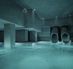 Level 71 is an expanse of tepid pools and waterslides with a relatively modern aesthetic. The architecture is fairly simple, with pools, stairs, and railings placed haphazardly throughout the level. Most of the light on Level 71 is derived from windows located on the walls, and these windows are entirely devoid of glass that appear to prevent people from falling out and/or breaking them. The temperature throughout the level remains stable at 59ºF (15ºC), and the cool temperature is thought to be caused by the lack of general heat sources. Tan ceramic tiles also cover the walls and floors, which appear to be teal at night. These tiles can lack friction and wanderers can easily slip on them, posing a slight hazard.