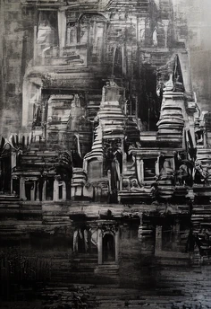The floating islands of the Level 82's archipelago appear to be completely covered in ancient pyramids and labyrinthian temples made of a black stone that reflects back the dark light of The Black Suns, eerily illuminating the islands like beacons in the grey expanse.