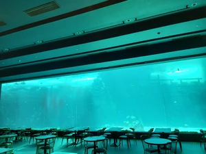 The glass wall that separates the restaurant from the aquarium has a particularly strange property: it can be easily broken. However, due to undetermined reasons, the water may not and will never enter nor flood the diner area. This strange property allows for wanderers to enter the aquarium at their own risk, while not harming or putting the lives of those in the restaurant in danger.