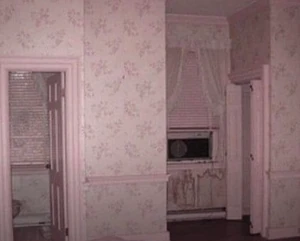Sublevel 5 is a narrow interior filled with small, adjoining rooms, all covered in faded floral wallpaper. The pattern is delicate and repetitive, with pale flowers and thin vines blending under dim, uneven lighting. The colours have faded into washed-out pinks and greys, giving the walls a tired, papery look, as if they have absorbed the same stale air for decades. The rooms connect through slightly misaligned doorways.