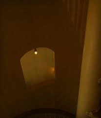 The material gives off a gentle warmth, neither comforting nor oppressive, just there, as if the maze has been holding heat since it was built. A thick, permanent fog fills the corridors from floor to ceiling. It is dark and heavy, dulling contrasts and softening the edges of everything it touches. Visibility fades quickly, causing hallways to dissolve into unclear shapes just a short distance ahead. Corners and intersections slowly appear from the haze, revealing themselves bit by bit as you move. Distant corridors sometimes look like faint silhouettes, blurred and distorted, never completely clear. There is no clear source of light (Besides the occasional light bulb). Instead, the walls themselves emit a soft, diffused glow that seeps into the fog, providing just enough illumination to move around.