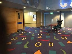 Sublevel 14 is an endless maze filled with brightly carpeted corridors and small lounge-like junctions, all designed with playful abstraction. The floor features thick carpet with looping shapes, scattered symbols, and bold colours repeating endlessly. Reds, blues, yellows, and greens curve and intersect without forming any clear design, creating an impression of movement frozen in the floor itself. The pattern remains the same, no matter how far the maze goes. The walls are smooth and clean, finished with light wood panels and neutral colours that sharply contrast the chaotic flooring. Doors appear at intervals along the corridors, flush with the walls and marked only by simple signs or small labels. Some doors are closed, while others are slightly open, but all lead into more corridors, meeting rooms, or lounge spaces that share the same design.