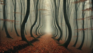 Level e的首个区域被命名为“数学之林”。这片森林无边无际,却蕴含多种非欧几里得性质与数学异象。森林始终处于类似秋日的状态,从未观测到季节更替[1]。深入森林越远,其几何结构就越不稳定。与Level 11类似,树木偶尔会呈现重复性几何形态。任何试图沿直线穿越森林的尝试均被证实极具风险,因为森林会频繁发生扭曲[2]。流浪者在森林中漫游一段时间后,可能会遇到一座位于森林中央的巨型房间,由此可进入区域二。