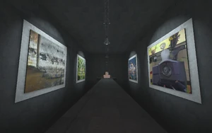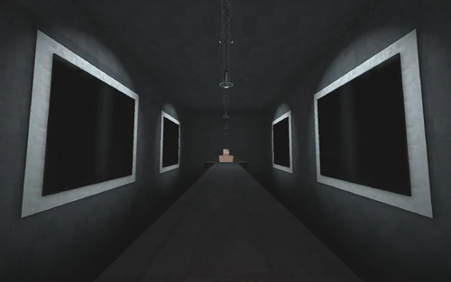 - 它消失之后,流浪者才得以窥探楼层真貌——用抽象的画作、毁坏的照片、模糊的视频以及不明其意的文字组成的巨大牢笼。从其入口向尽头看去,它的对称感被明显地破坏了。空间所塑造的美感也并不完整,不时在诡异萦绕的耳边低语也是空间令人心烦意乱的原因之一。被巨型画框的限制被迫放大的画作与照片钉在了墙上展示。原本其中不应被轻易发现的细节也被呈现在观赏者眼前,无法反抗,只被解读与解剖。